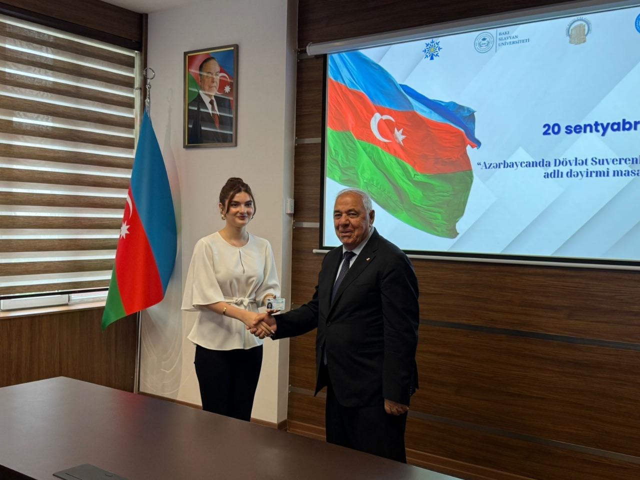 Bakı Slavyan Universitetində Yeni Azərbaycan Partiyasının Nəsimi rayon təşkilatının, Nəsimi Rayon İcra Hakimiyyətinin, BSU-nun, Nəsimi Rayon Ağsaqqallar Şurasının birgə təşkilatçılığı ilə "Konstitusiya və Suverenlik İli" çərçivəsində 20 Sentyabr - Azərbaycanda Dövlət Suverenliyi Günü münasibətilə “Azərbaycanın Suverenliyi - Milli İradəmizin Təntənəsi” mövzusunda dəyirmi masa keçirilib.